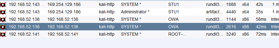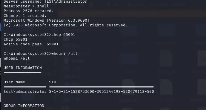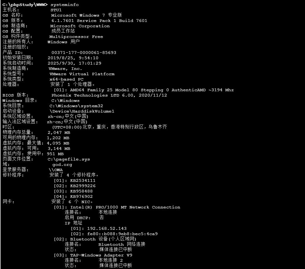 systeminfo查看系统信息,可以确定当前域为god.org,域服务器名称为OWA,并且还打了四个补丁