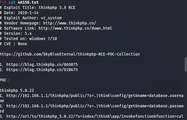 发现最后一个是thinkphp5.X版本的RCE,进入该漏洞的文件46150.txt: