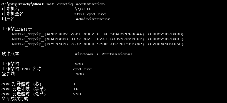 net config Workstation 查看当前计算机名称,全名,用户名,以及所在的工作站域等信息