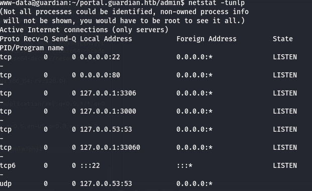 得到了带有 WWW-data 用户的 shell,一个最低权限用户,无法运行 sudo 命令,所以要检查打开的端口和服务。