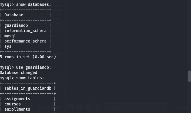 mysql -h 127.0.0.1 -u root -pGu4rd14n_un1_1s_th3_b3st guardiandb