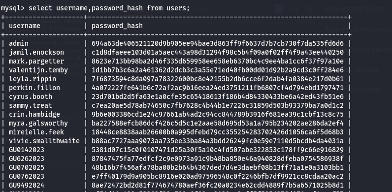 端口 3306打开,我们还从源代码中看到 config.php包含凭据,因此可以将其用于访问 mysql