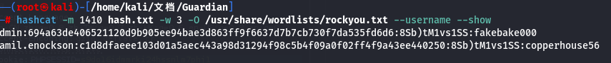 hashcat -m 1410 hash.txt -w 3 -O /usr/share/wordlists/rockyou.txt --username --show