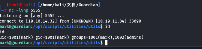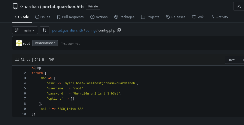 在Guardian/portal.guardian.htb的config/config.php中发现数据库凭证