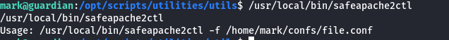 sudo /usr/local/bin/safeapache2ctl -f /home/mark/confs/shell.conf
