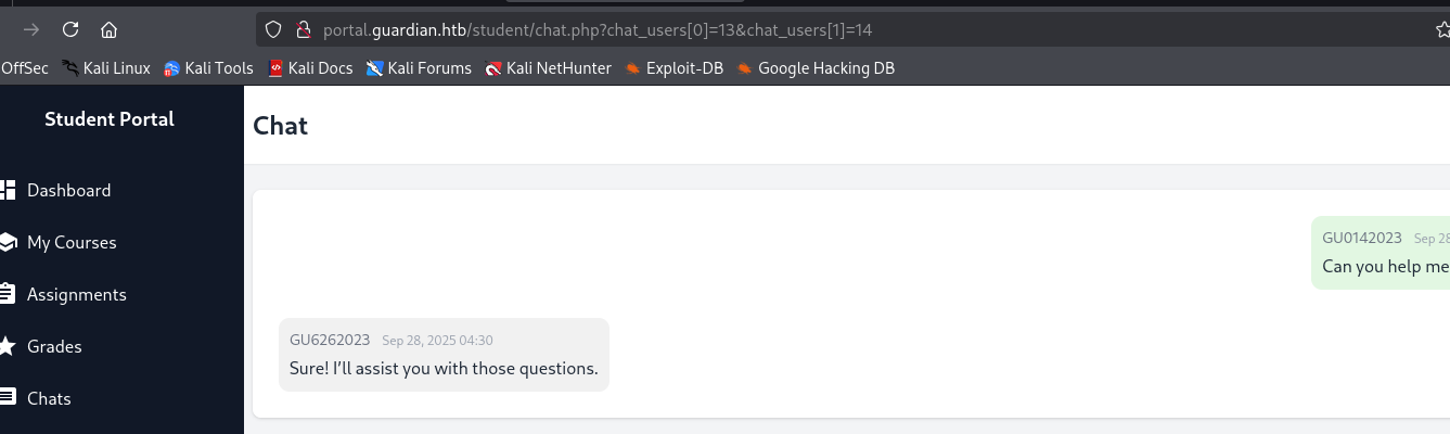 访问http://portal.guardian.htb/student/chat.php?chat_users[0]=2&chat_users[1]=1