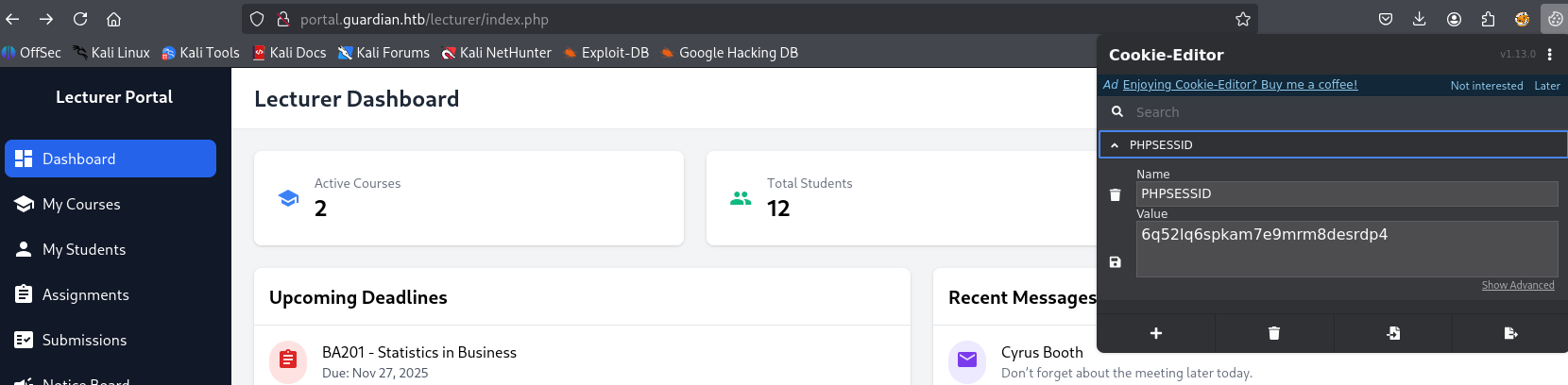 在http://portal.guardian.htb/lecturer/notices/create.php中找到一个